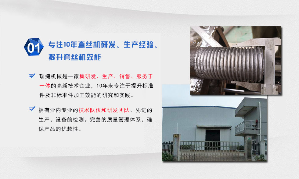 本套絲設(shè)備屬于無削加工設(shè)備,運用特殊的切削技術(shù),上絲輕盈快捷,提高生產(chǎn)效率,采用三點一線,同心度高,性能穩(wěn)定等優(yōu)點,本機每分鐘可切削3-5根工件,速度快,效率高,對于一些不定長度的鋼結(jié)構(gòu)公司,橋梁工程,電力設(shè)施等大企業(yè)的批量生產(chǎn)之需要。